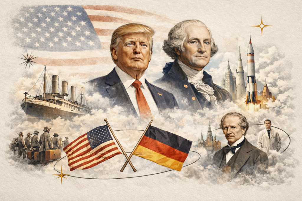 # “Donald Trump est le petit-fils d’un Allemand qui émigra aux États-Unis en 1882 et y fit fortune dans l’hôtellerie.” Dans la liste des germano-américains : l’écrivain John Steinbeck (1902-1968) ; les actrices Kim Basinger, Mery Streep et Grace Kelly ; les acteurs Marlon Brando (Brandau), Tom Cruise (Kruse), Clark Gable, Robert de Niro et Leonardo Di Caprio ; les généraux George Custer (Küster), John Pershing, Dwight Eisenhower (Eisenhauer) et Norman Schwarzkopf ; le fondateur du FBI, Edgar Hoover (Huber) et son homonyme Herbert, président de 1929 à 1933; le secrétaire (ministre) à la Défense Donald Rumsfeld. Dans le secteur économique, signalons Boeing, Rockfeller, Chrysler (Kreisler), Heinz, Pfizer, etc. » (NRH )